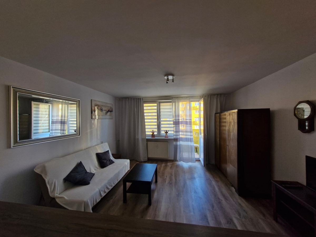 Very nice apartment. There is a kitchen with a living room, bedroom, bathroom and a balkony. Behind the building there's a small forest as well as a nice park. Around 200 m from the appartment there's a shopping mall and a cinema. For guest use there`s a undergrung car park with dedicated place. In the kitchen for comfort f guest there are basic kitchen staff like coffee, tea, sugar, salt, oil, spices etc... Night silence applies between 22.00-06.00 so it`s not adequate for parties.