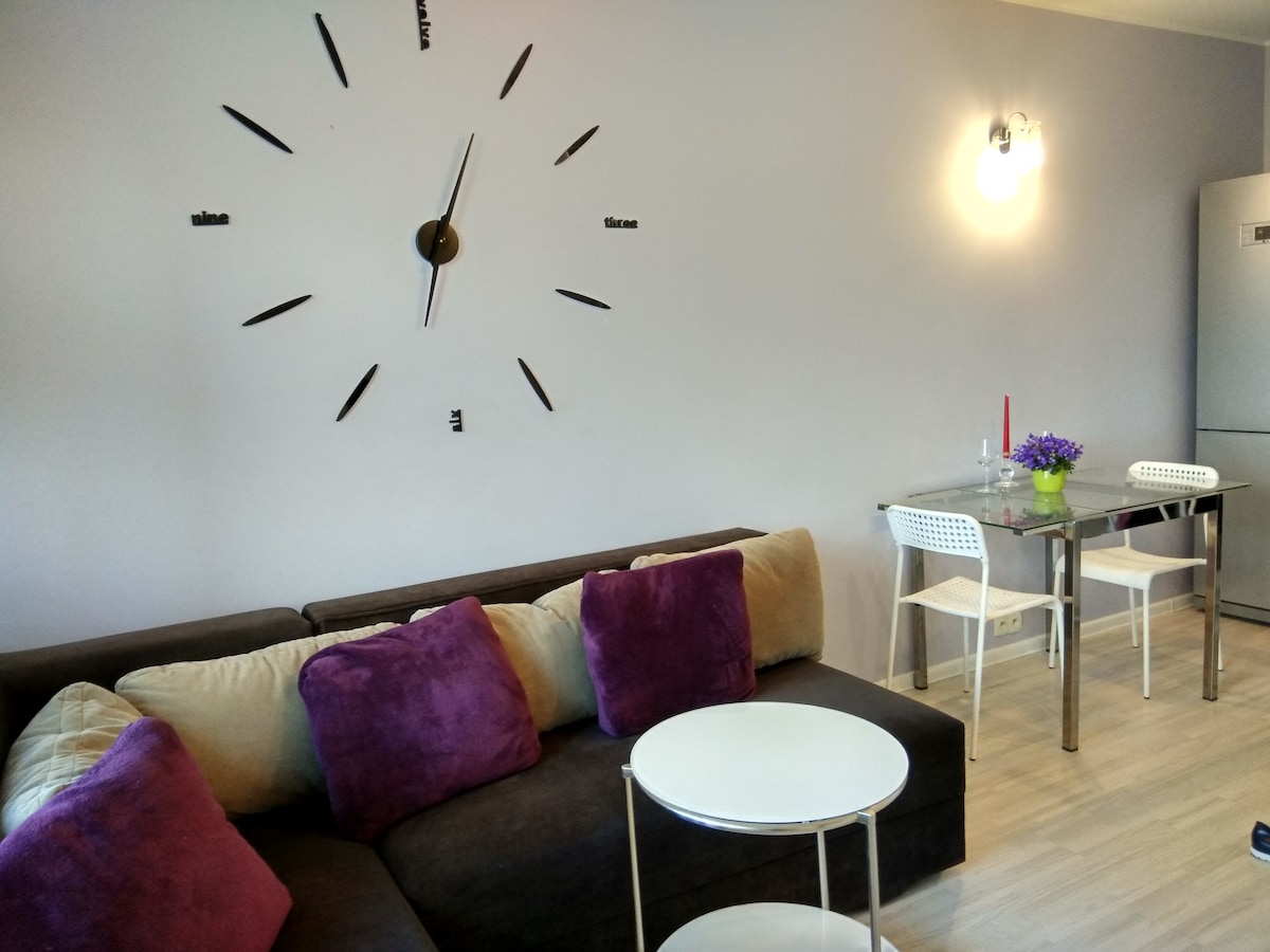 Very nice apartment. There is a kitchen with a living room, bedroom, bathroom and a balkony. Behind the building there's a small forest as well as a nice park. Around 200 m from the appartment there's a shopping mall and a cinema. For guest use there`s a undergrung car park with dedicated place. In the kitchen for comfort f guest there are basic kitchen staff like coffee, tea, sugar, salt, oil, spices etc... Night silence applies between 22.00-06.00 so it`s not adequate for parties.