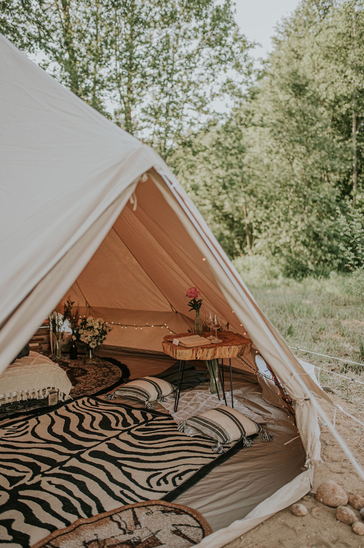 Zarezerwuj pobyt w tym miejscu i odpocznij na łonie natury. Wygodny luksusowy namiot bell-tent nad rzeką Liwiec. Wyposażony w komfortowy materac, pościel, czajnik i podstawowe naczynia, grzejnik na chłodniejsze noce. Ten mniejszy namiot jest zdecydowanie rekomendowany dla 2 osób.