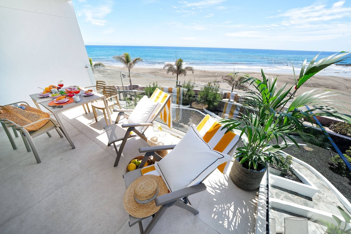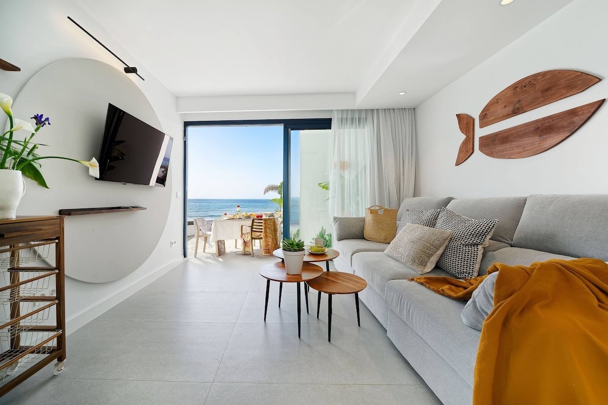 Located in the very first line of the beach, this apartment stands out for its unique style inspired by the 1950s Palm Springs architecture. With unbeatable sea views, it is ideal for couples or families with up to two small children who are looking for design, tranquility, and an exceptional location.<br><br>Located on the garden floor, it offers a private terrace with sun loungers and a table for outdoor dining, right next to the seafront promenade.