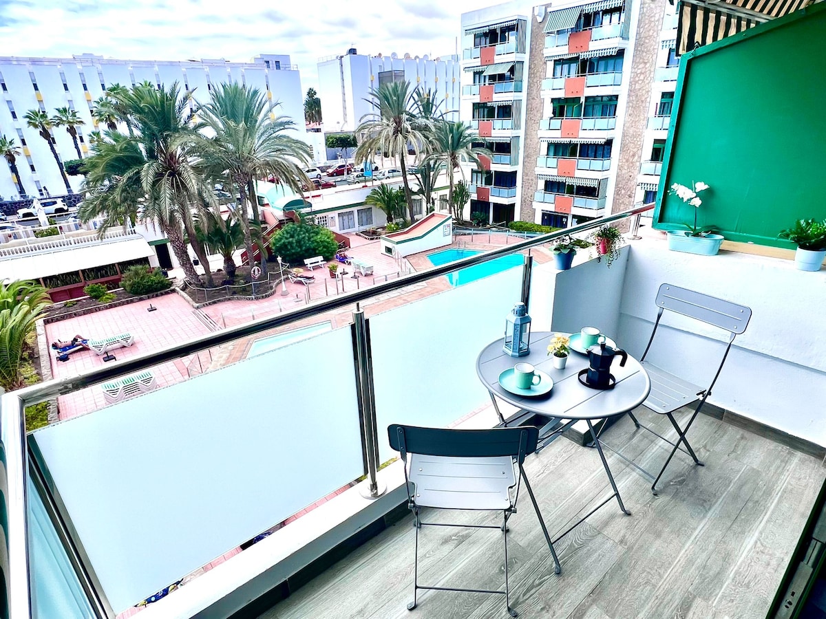 Beautiful, modern completely renovated apartment with one bedroom, one living room with full equipped kitchen and a nice balcony ( pool view). Two quiet Air-conditions Free high speed fiber Wi-Fi & good work place. Washing-machine. 500 meters to the beautiful Maspalomas beach, Across the street, big supermarket & super close to Yumbo center (5 min by foot). A wonderful roof terrace (mountain and seaview) where you can relax and sunbath with or without clothes (The elevator takes you easly up)