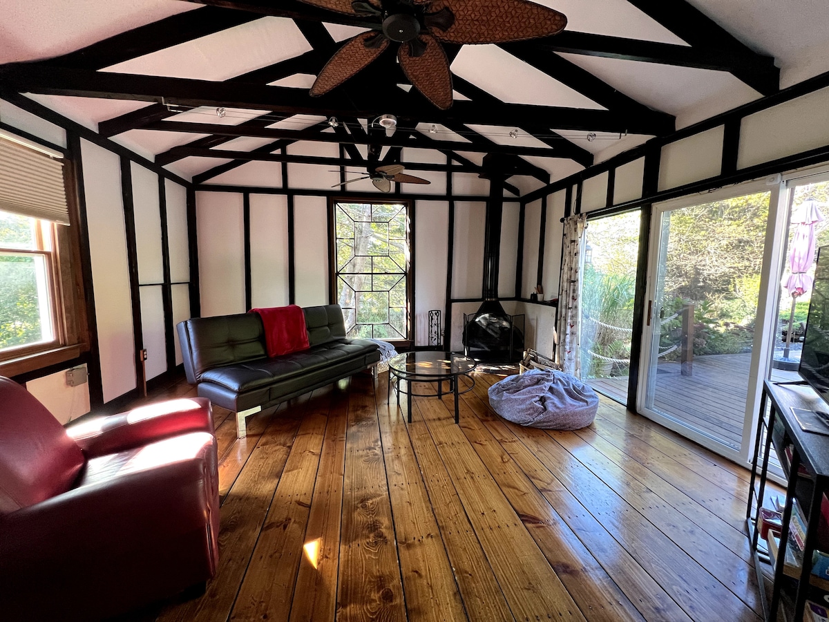 Gorgeous, unique guest house with cathedral ceilings, cupola, front and back decks, three-wall screened porch, fully functional kitchen with Wolf stove, dishwasher, full-sized refrigerator, a/c, ceiling fans, appleTV, internet, two woodstoves (gas, wood). One mile from downtown Northampton, near Childs park, retreat-like environment. Unforgettable space!