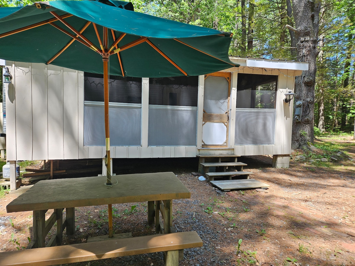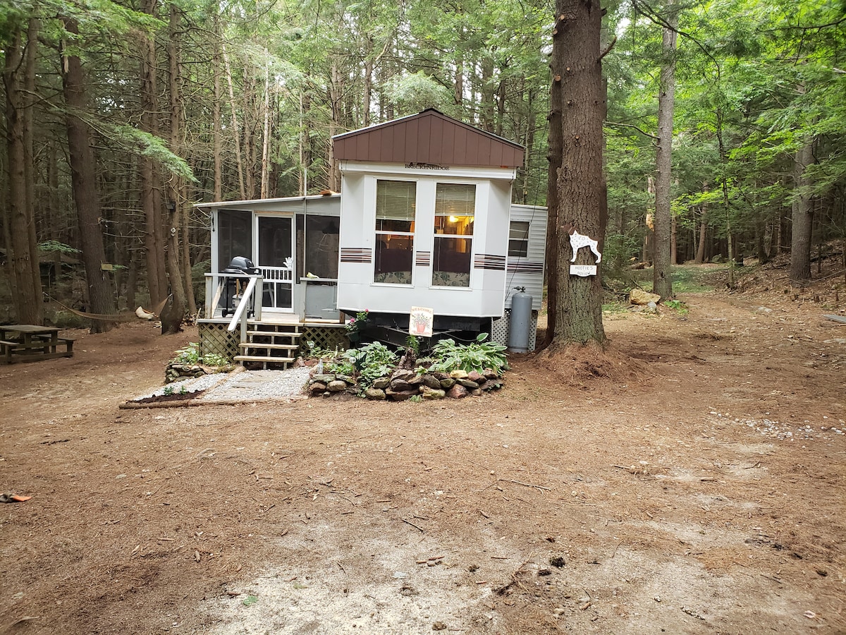 Park model get away in the woods on a stream that feeds into a stocked trout pond. Sit on the screened porch & listen to nature while quietly relaxing. Located in a small private campground on 200 acres of private wooded land in Central Massachusetts. Located on hiking trails that are also used for mountain biking & horseback riding. Bring your own linens but kitchen is fully equipped. No wi-fi...no tv...minimum cell service. A great place to enjoy the out of doors, disconnect & recharge.