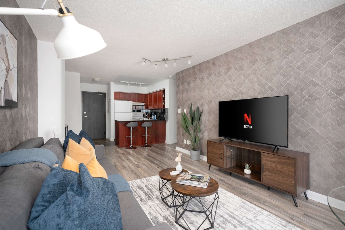 Stay in the heart of downtown Toronto in this modern one-bedroom condo just steps from the CN Tower, Rogers Centre, and the waterfront. The unit features a comfortable queen bed in the bedroom and a sofa bed in the living room, perfect for couples or small groups. Enjoy skyline views through floor-to-ceiling windows or relax on the private balcony. The condo includes a full kitchen, smart TV, high-speed Wi-Fi, and in-suite washer and dryer. Guests also have access to a gym and outdoor pool .