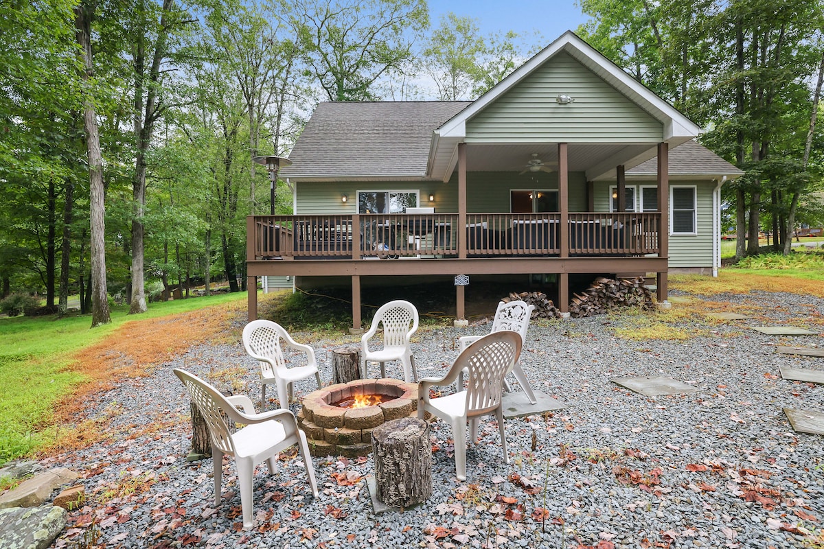 Peaceful lakefront property on private 110 acre lake in the beautiful Pocono Mountains! Enjoy fishing and kayaking off the private dock, take in views of the lake and wildlife, or venture out to Lake Wallenpaupack and other local activities. This house is family-friendly and stocked with board games, pool table, kayaks, fishing poles, grill, fire pit, streaming services, and all the amenities you need for your getaway. Less than 10 minutes to the historic town of Hawley and Lake Wallenpaupack.