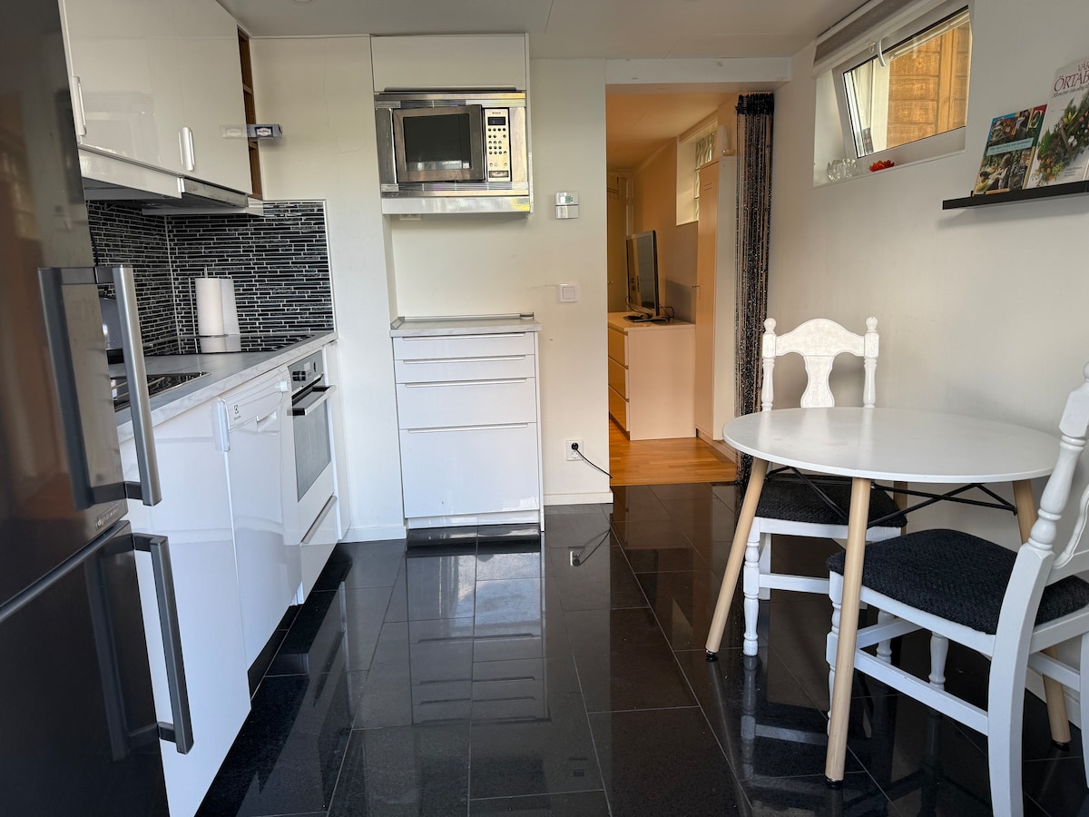 Du bor centralt, nära till restauranger, caféer, Slottsskogen och stans äldsta kvarter med sina charmiga gator och hus. Huset har hiss, lägenheten är modern, området är bilfritt, tyst, grönt och fridfullt. Hissen går ner till det låsta garaget under huset, där garageplats kan hyras. Vardagsrummet ligger i en öppen vinkel med köket, där det finns diskmaskin, kyl, micro och full utrustning för matlagning. Sovrummet har dubbelsäng. Badrummet är rymligt och har dusch, tvättmaskin och torktumlare.