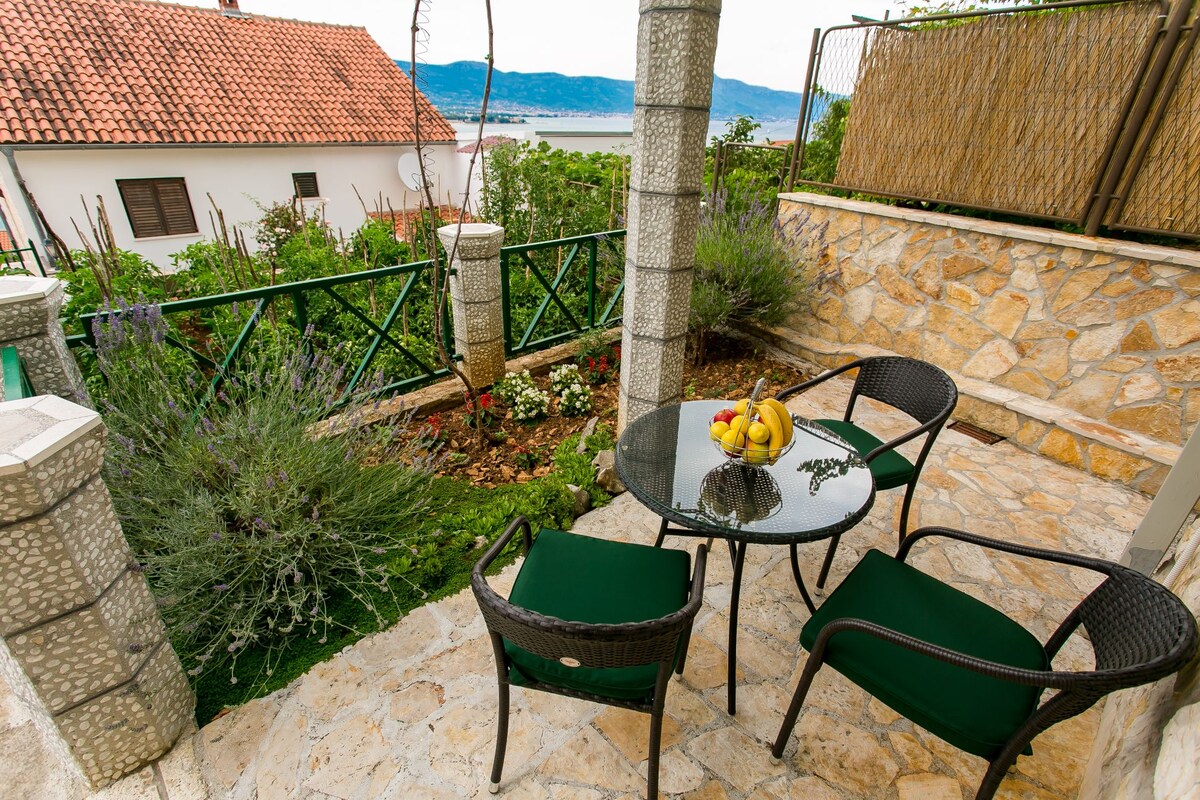 The apartment was newly built, 2021.The apartment is in a block,connected to a family house.. It has two floors with a separate entrance. Guests can use a part of the garden in front of the apartment with a table and chairs. Atractive beach with plenty things to do is 2 minutes . The apartment you can enjoy and relax, and if you want any other activity ,its near by .Trogir is a 15 minute walk and there is a boat every 10 minutes .Enjoy the sun and the Adriatic sea in an attractive location ''.