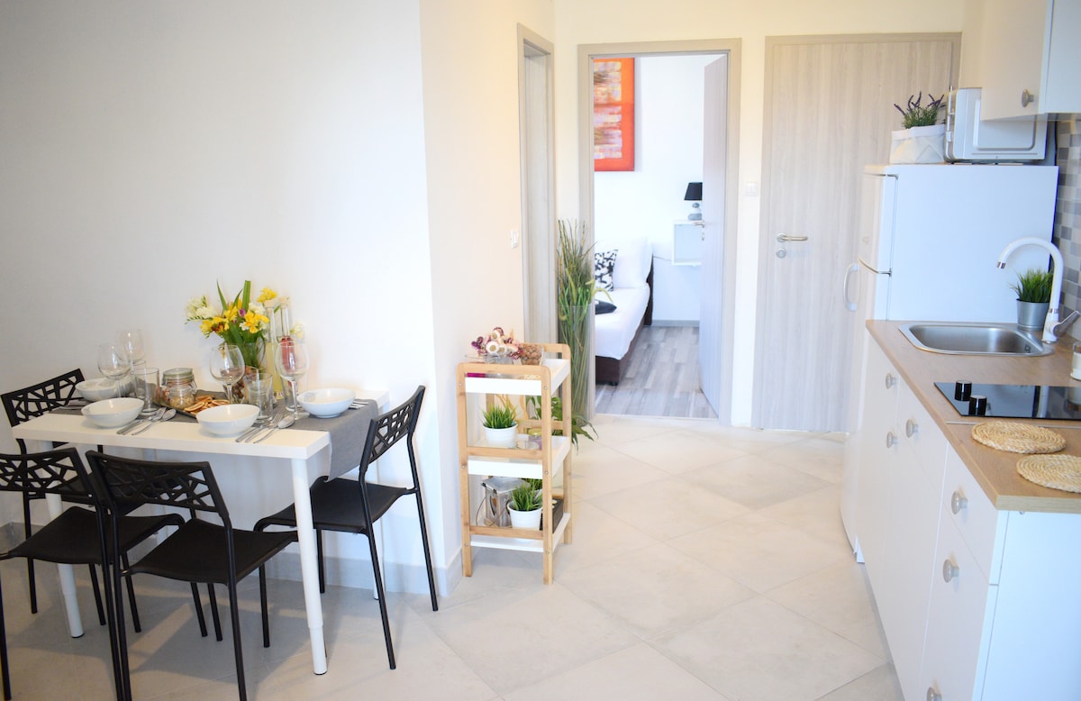 It's an apartment on the ground floor in a traditional family house. It consists of big entryhal, 2 bedrooms, bathroom with shower, kitchen, dinning and living room in one. It's newly renovated and just 30 m airline from beach.