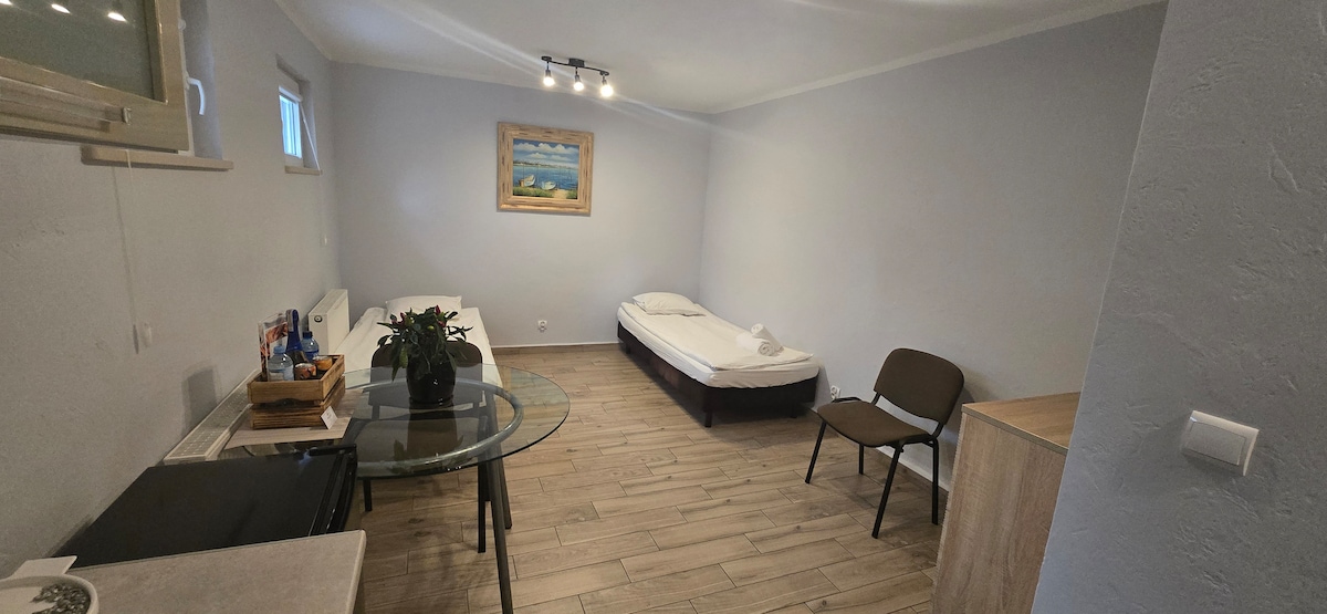 2 przestronne sypialnie z łazienką. Wyposażenie hotelowe, radio, tv, czajnik elektryczny i lodówka. W 1 sypialni podwójne łóżko. Możliwość dostawki dla 5-tej osoby. Ręczniki na wyposażeniu.