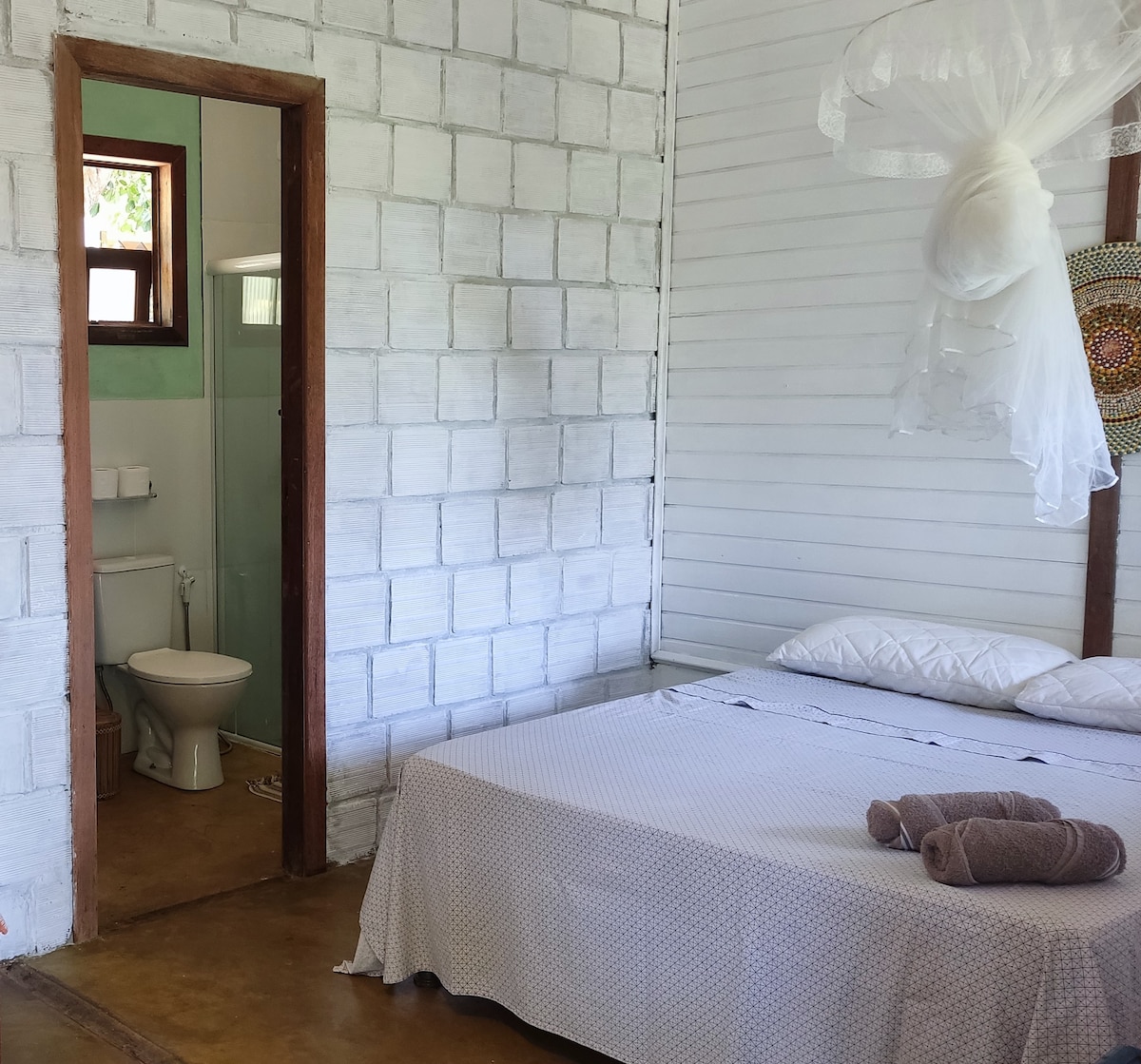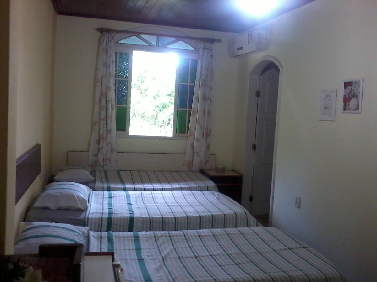 Suíte aconchegante, acomoda até 4 pessoas, localizada a 1,0 km da praia, equipada com TV e ar condicionado,frigobar, Wi-Fi, banheiro privado, área de serviço externa compartilhada, uma rede na varanda, uma pequena piscina para relaxar, galinhas, tartarugas para as crianças se distraírem e ouvir o som dos animais. Perfeito para quem aprecia o convívio com a natureza.