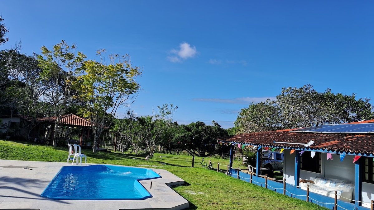 Viva momentos inesquecíveis neste lugar único e ideal para famílias. Um Chalé numa chácara de 4 mil metros quadrados, de pura natureza, rodeada por matas e árvores frutíferas e margeado pelo Rio Imbassai, de forma particular. Além das belezas naturais locais, fica a 4 km da Praia de Santo Antônio, a praia mais nativa e pé na areia do Litoral norte, próximo a Imbassai, um dos lugares mais charmosos da Linha Verde e a 15 km de praia e vila mais badala, a famosa Praia do Forte.