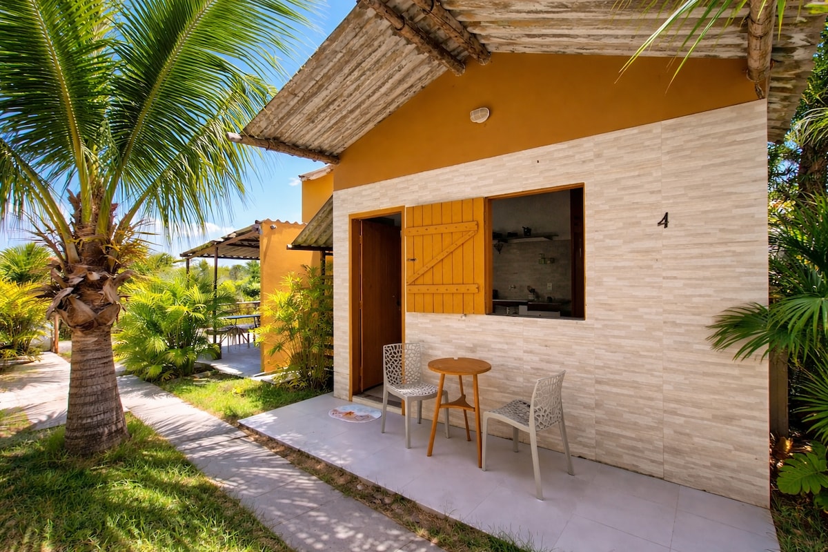 Suíte aconchegante, acomoda até 4 pessoas, localizada a 1,0 km da praia, equipada com TV e ar condicionado,frigobar, Wi-Fi, banheiro privado, área de serviço externa compartilhada, uma rede na varanda, uma pequena piscina para relaxar, galinhas, tartarugas para as crianças se distraírem e ouvir o som dos animais. Perfeito para quem aprecia o convívio com a natureza.