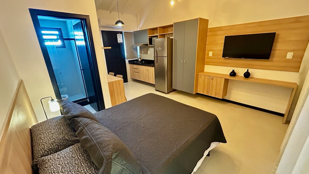 Relaxe encurta sua estadia Praia do Forte com suas piscinas naturais, vila e parque ecológico em um condomínio bonito e estruturado com academia, quadras, parquinho infantil, vaga privativa e piscina com bar. Sinta-se em casa neste estúdio amplo, equipado totalmente refrigerado, com mezzanino para ter privacidade e conforto