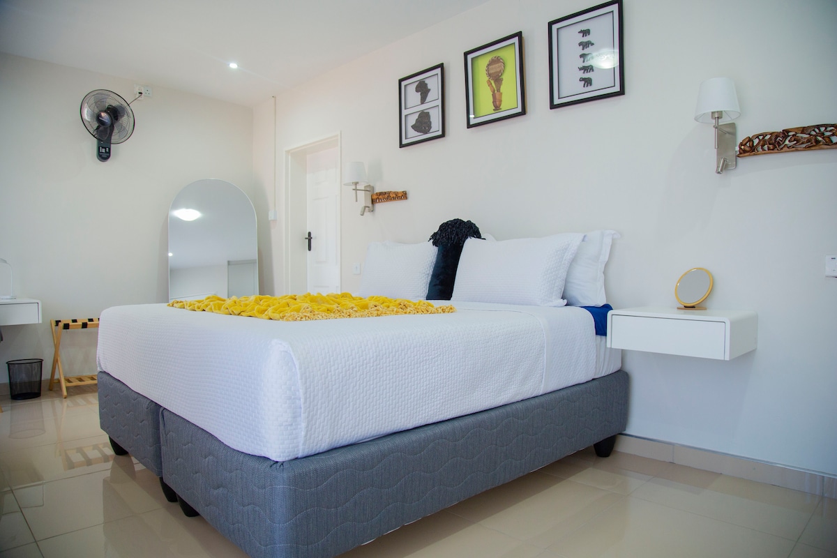 This unique place has a style of its own. Enjoy your stay in this compact studio apartment designed for sleeping, eating & dining. The kitchenette is fully equipped with a gas hob, mini fridge, & microwave. There is a separate bathroom with a shower. TV with DSTV (cable TV) is available, as well as wifi access. For backup electricity, there is a solar system The studio apartment is attached to the main house, with its own outside entrance, & parking on site.