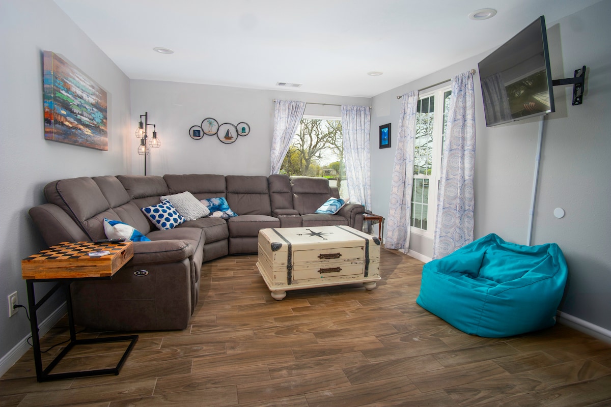 Hidden Gem - waterfront home on the Colorado river.On the town side,bit of a change to the beach road homes. It has gorgeous porch to soak in river views,enjoy the sunset & fishingwith your family. Private dock and lighted pier with fish cleaning station. 3 bedroom and 3 full baths in all, 2 huge master bedrooms with king beds and en-suite bathrooms. Game room with pool table and AC. Tv in each room with WiFi to bring your favorite entertainment. Quick drive to the amazing Matagorda beach!