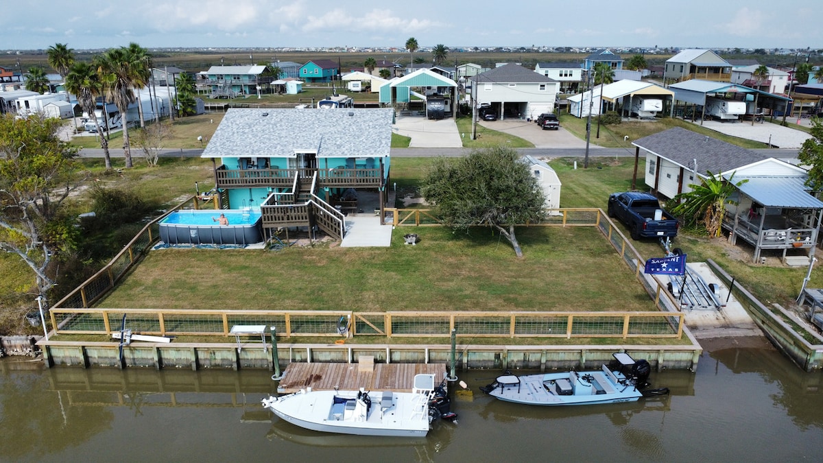 The ultimate get away with beautiful sunsets, coastal wildlife, and star filled nights. Lighted dock with green light allows fishing right out the back door at high tide. (Redfish/black drum/flounder - see pics). This modern space (2400 sq ft) boasts of 5 TVs, 3 bathrooms, game room with ping pong, electric fireplace, parking for 3 vehicles, and a FULLY stocked kitchen. Palacios, "a city by the sea" is a small, hidden fishing town with ample charm! Public fishing piers/boat ramps ice the cake.