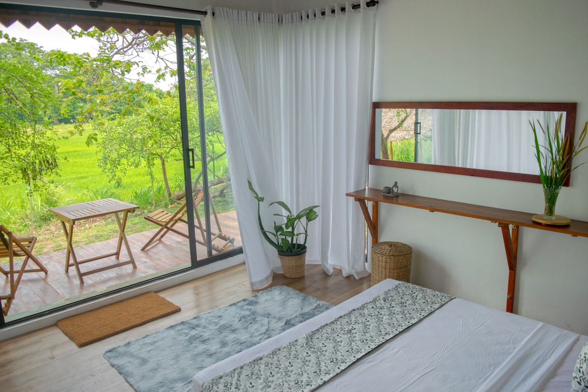 Stay just a 7-10 minute walk from the famous Sigiriya Lion Rock in our private, luxury cabana. This AC-equipped sanctuary features a private plunge pool, hot water, TV, and a mini-fridge, all designed for your ultimate comfort. Enjoy your included breakfast on the terrace while listening to wild birds and spotting Hornbills or Giant Squirrels. To make your trip perfect, we also arrange Tuk-Tuks, van rentals, and Jeep safaris directly from the property.