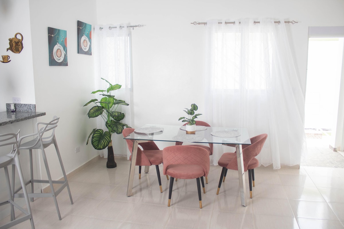 Aroma del Mar, un espacio moderno, cálido y cuidadosamente decorado para que te sientas como en casa desde el primer momento. Este acogedor apartamento está ubicado a pocos minutos de la playa y ha sido diseñado para ofrecerte una estadía cómoda, funcional y con ese toque tropical que tanto gusta. Relájate en una sala luminosa con detalles artísticos y mobiliario cómodo, cocina equipada con barra, y disfruta de una habitación con cama queen, una vibra relajante que invita al descanso.