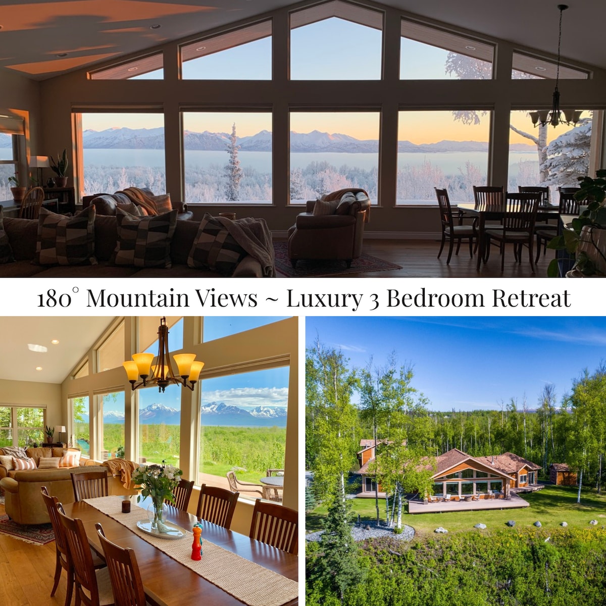 Welcome to the “CHALET ABOVE THE TREES” a luxury mountain view retreat in Wasilla, Alaska 🌲 Enjoy peace & tranquility perched above the trees, with huge wall of South-facing windows. Experience amazing views from *every* room, vaulted ceilings, open concept, and Alaska’s most comfortable beds. STUNNING VIEWS: Pioneer Peak, Twin Peaks, Chugach Mountain Range, Inlet. HIGHLIGHTS: + 3,000 sq. ft. + 180° Mountain Views + Huge Chef’s Kitchen + 2 Gas Fireplaces + Soaker Tub + Quiet Cul-de-sac