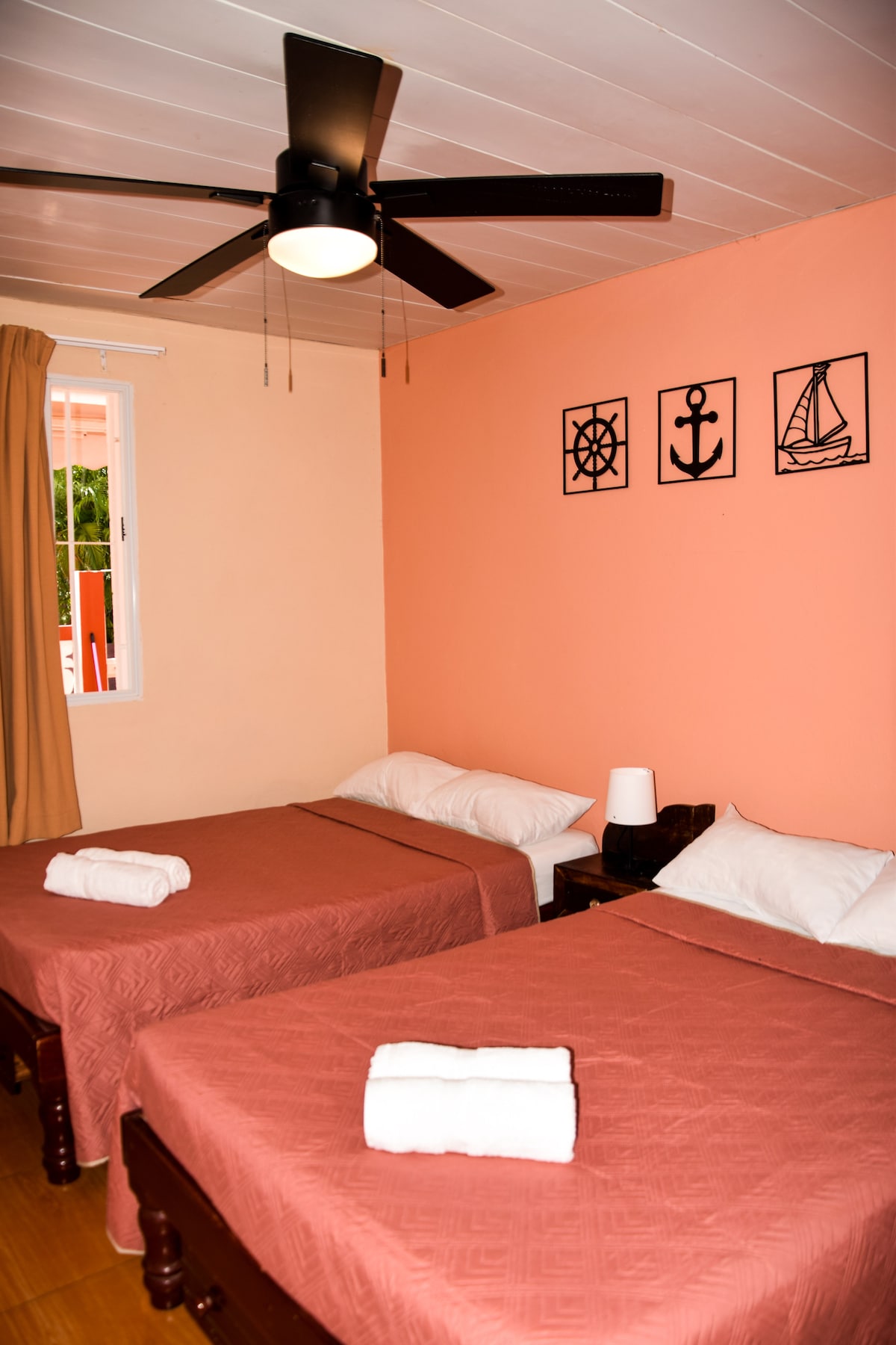 Es un apartamenento independiente amplio. Con un dormitorio con dos camas, (una grande y otra más pequeña), aire acondicionado, caja fuerte, perchas para la ropa y televisor. Un baño con agua fría y caliente; cocina equipada con todo para la elaboración de alimentos (microondas, cafetera, tostadora, ollas, fogón de gas, refrigerador), una pequeña mesa plegable y tres taburetes para comer, uso de la lavadora. Una terraza común rodeada de plantas con sillones, mesa y sillas y un hermoso jardín.