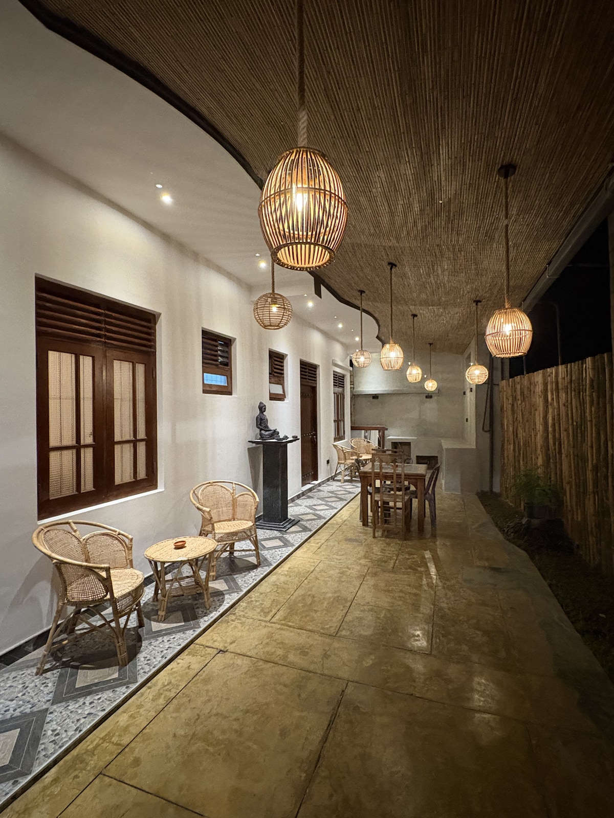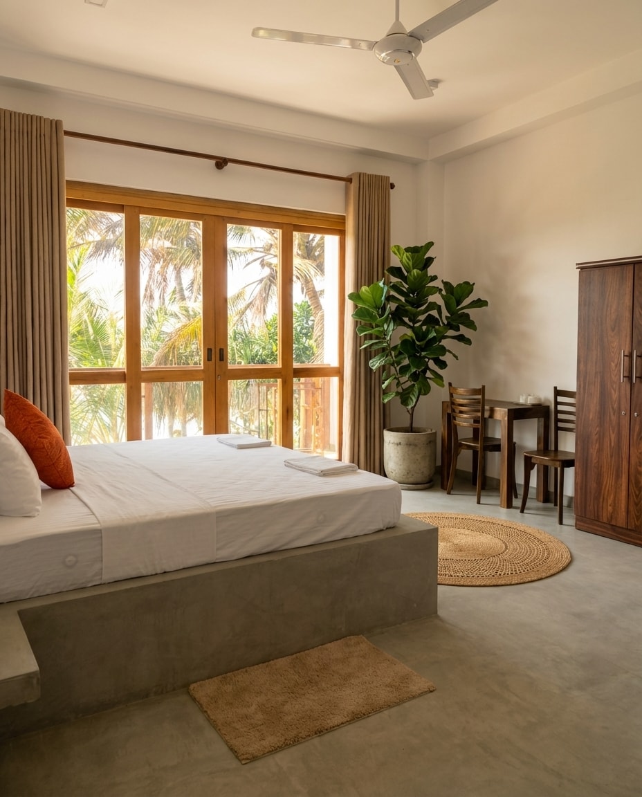 With AC Fall asleep to the sound of the ocean at our peaceful haven in the heart of idyllic Madiha village. Each of our three double bedrooms has a comfy double bed with brand-new mattresses, bespoke Sri Lankan-made furniture including a desk and chair, polished cement bathrooms with airy showers, and a private terrace. Your private deck unfolds directly into our cafe and restaurant where delicious breakfasts, lunches, and dinners await.