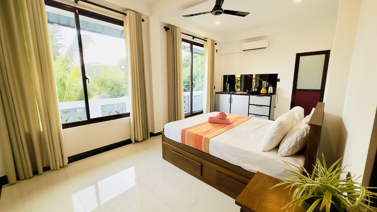 Experience comfort at Astro Villa’s first-floor suite, featuring an A/C bedroom, private kitchen, and bathroom. Relax on the balcony and soak in the tropical vibes, just a short distance from Weligama’s hotspots like Marriot, W15, and Kurumba Bay. Perfect for couples or solo travelers, this stylish space offers free Wi-Fi, parking, and a cozy ambiance. Whether you’re here for surfing, dining, or simply unwinding, this private getaway ensures a hassle-free and memorable stay.