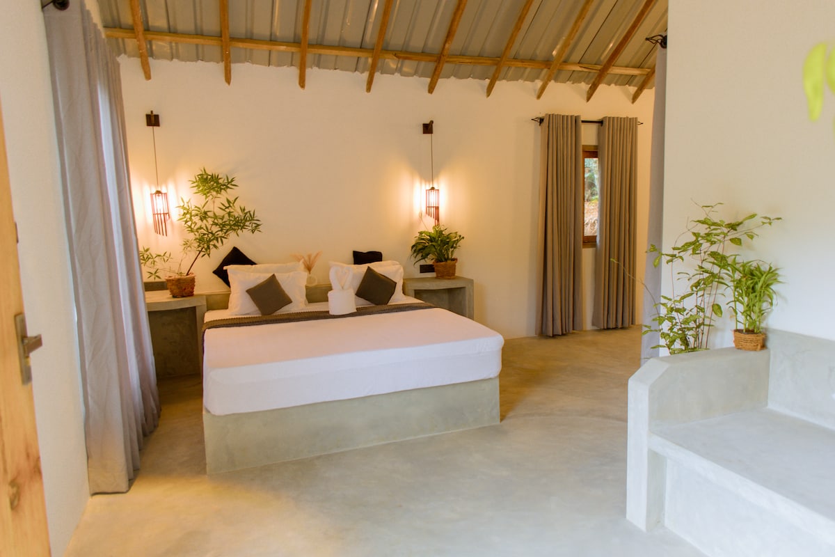 Experience tranquility at Janidu Eco Villa, a cozy 2-bedroom retreat just 2.9 km from the beach. Nestled amidst lush greenery, it offers stunning views of a serene canal and vibrant paddy fields. The villa features one bed in a private bedroom and another in the living area, cooled by a single air conditioner in the living space. Amenities include a refrigerator, electric kettle, hot water, and kitchen equipment, making it the perfect escape for relaxation and convenience.