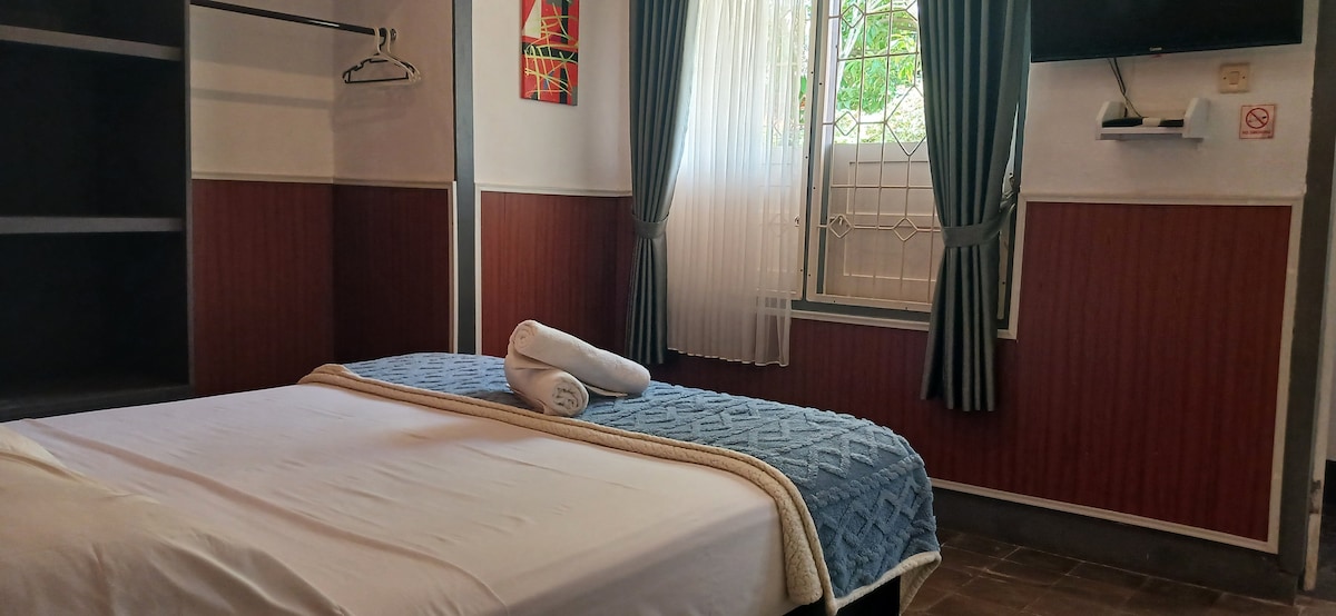 Kamar Double AC Kamar mandi pribadi Ukuran 16 m² 1 double besar Tempat tidur nyaman, The double room offers air conditioning and a tiled floor, as well as a private bathroom boasting a shower. The unit has 1 bed. Fasilitas: Meja kerja TV Seprai Lantai keramik Handuk Stop kontak dekat tempat tidur AC Papan Jemur Baju Aturan rokok: Bebas rokok