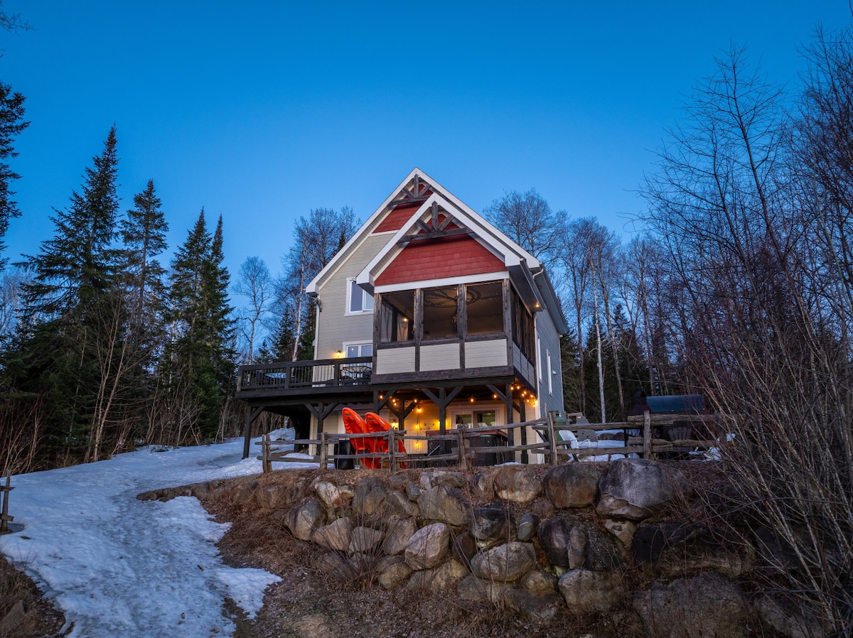 Venez décrocher de la ville dans ce magnifique chalet perché sur un lac sans bateau à moteur dans un espace très boisé et privé. Une vue incroyable et de majestueux balcons. Le chalet comporte trois chambres fermées. Pour baignade, spa , paddle board, canot, kayak, randonnée, ski de fond, ski alpin, raquettes, VTT, motoneiges, ou y travailler à distance!