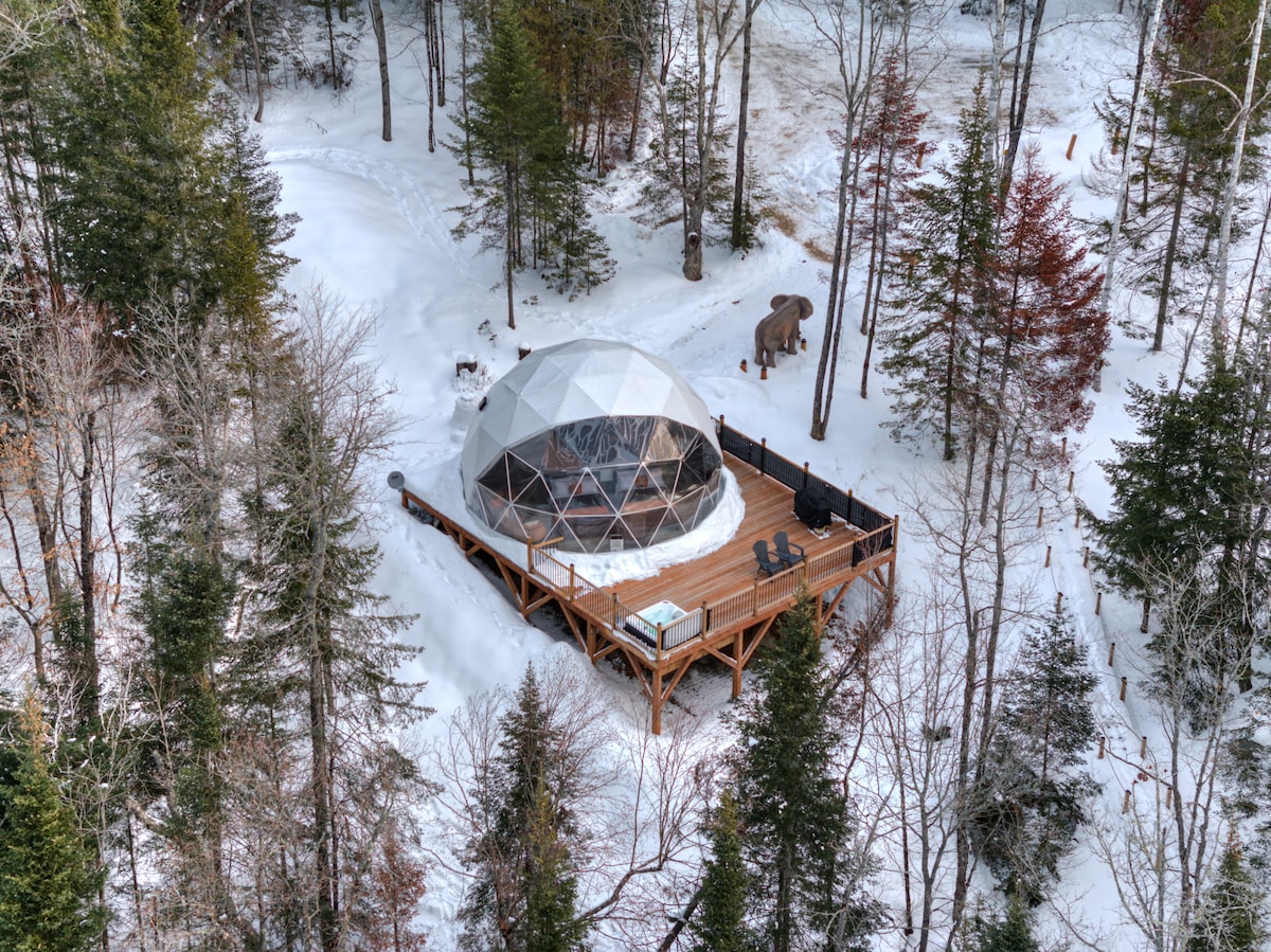 Dôme LA HUTTE Situé directement au bord d'un lac sauvage, ce dôme vous offre une vue imprenable sur un véritable sanctuaire faunique. Vous pourrez y observer plusieurs espèces animales dans leur milieu naturel dont les castors, loutres, tortues, grenouilles et Quiscales. Vivez une expérience exceptionnelle en tout confort au coeur de la nature. Réveillez-vous avec le chant des oiseaux, le vent qui souffle, le silence. L'endroit idéal pour se ressourcer et sortir de son quotidien.