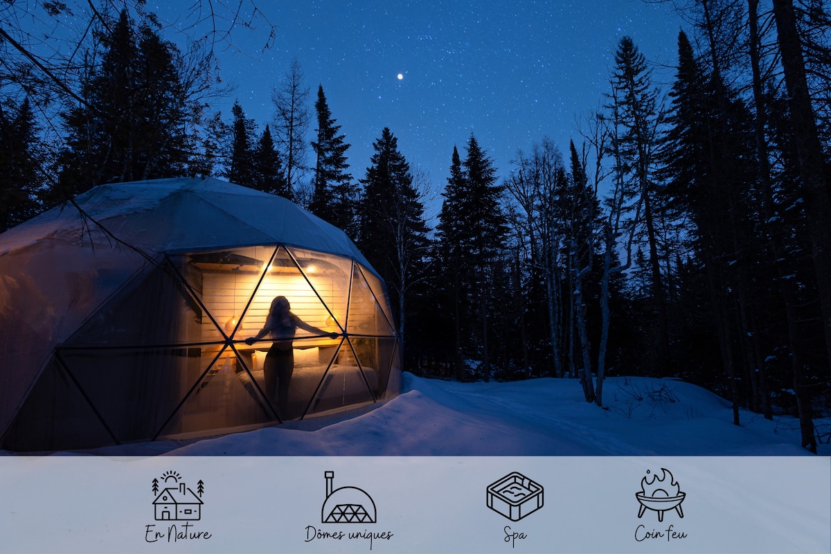 Visit our Airbnb profile to see the listings of our 6 private domes :) Welcome to Gîte l'Évasion! Experience sleeping under the stars in the comfort of a queen bed, in the wonderful Lake Superior region. ✲ 25 minutes to Tremblant ✲ Private 4-season spa ✲ Indoor Gas Fireplace ✲ Fire pit ✲ Private terrace with BBQ ✲ Footpath ✲ Private shower ✲ Full kitchen ✲ AC ✲ Included: Bedding, towels, sanitary and food essentials