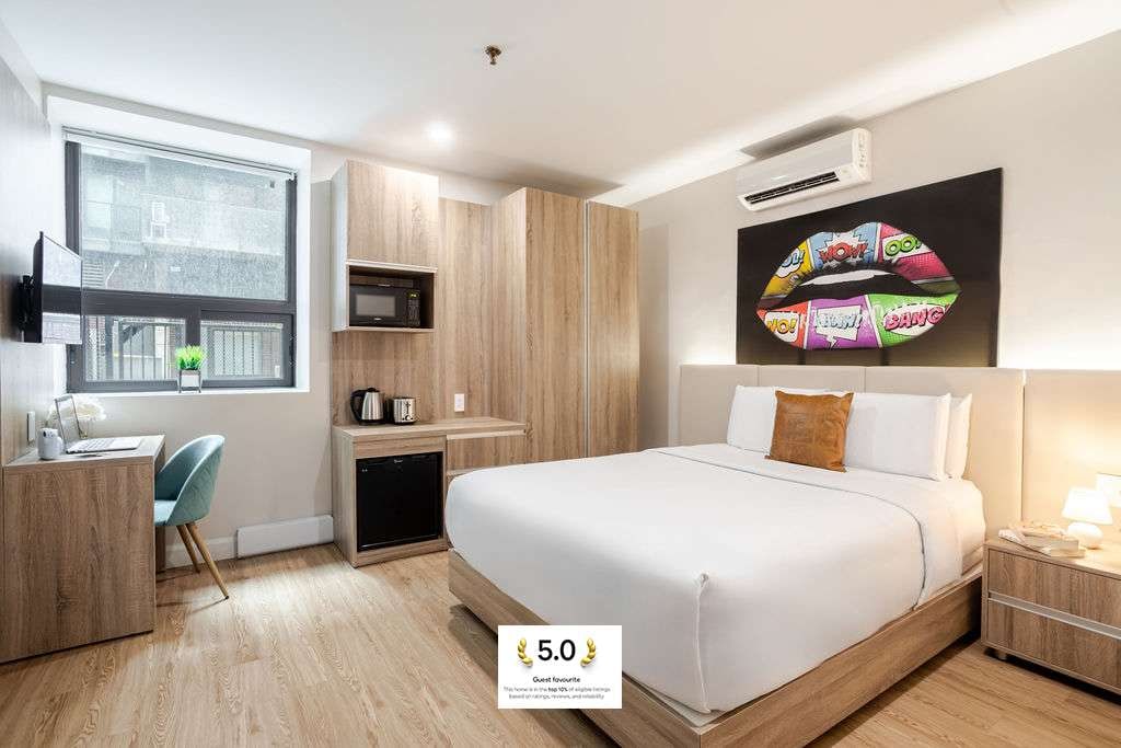 This elegant hotel room blends style and comfort, featuring a plush kqueen bed with premium linens. Located in one of Montreal’s most vibrant neighborhoods, you’re steps from cafés, bars, and cultural gems. Guests also enjoy access to a welcoming lobby lounge and a spacious basement with cozy seating, a pool table, and big-screen TV—perfect for work or relaxation.