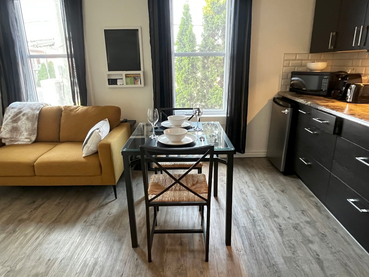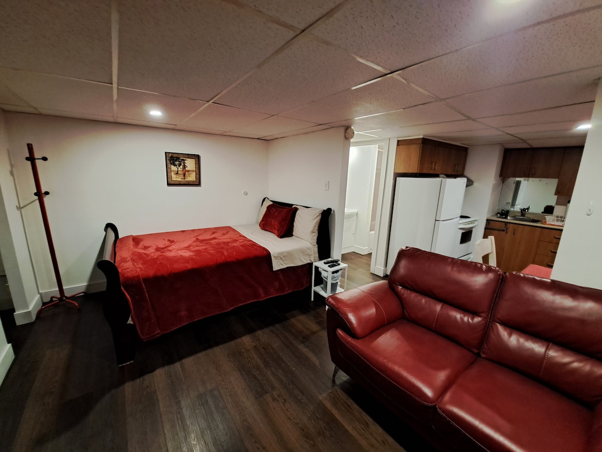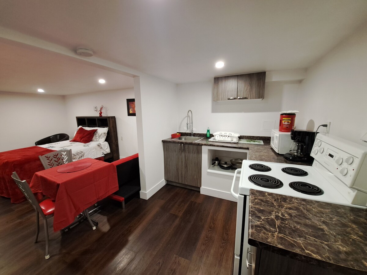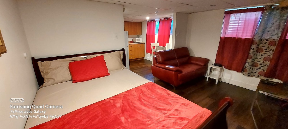 Petit studio au goût du jour situé à 4 km de voiture du centre-ville. Épicerie, centre commercial et transport en commun à distance de marche. Terrasse extérieure. Studio conçu pour 2 personnes et possibilité de dormir à court terme jusqu'à 4 personnes ( lit double 54x75) et fauteuil-lit).Espace restreint a la salle-de-bains. Commodités pour cuisiner sur place. Logement adjacent à la maison de l'hôte, entrée indépendante et stationnement. Air climatisé de fenêtre et ventilateur. # CITQ 309856.