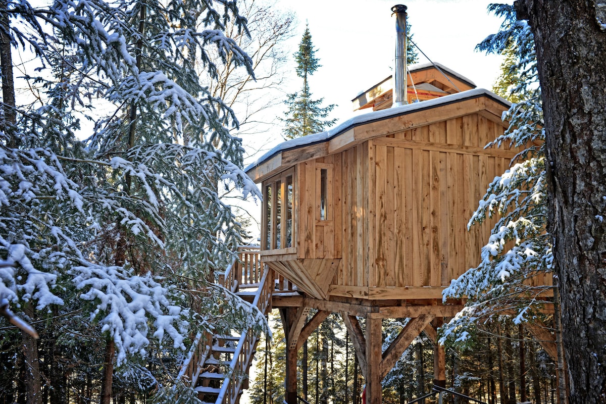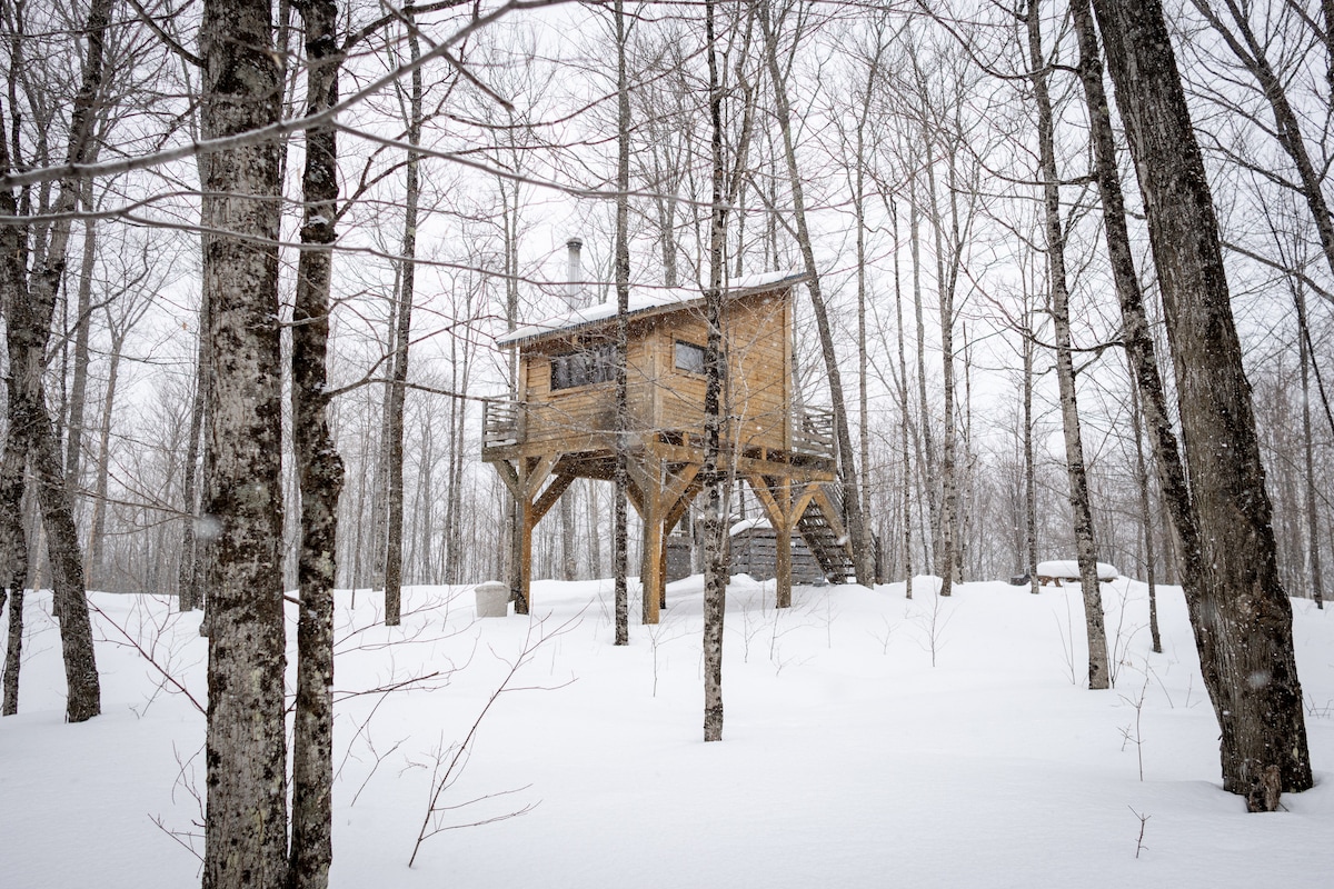 Nichée à flanc de montagne dans les branches et les feuilles, la maison dans les arbres de l'Épervier est très intime et parfaitement intégrée à sa forêt naturelle. Perchée sur 10 pieds de pilotis, c'est l'observatoire idéal de la faune le jour et des étoiles la nuit depuis sa terrasse panoramique à 30 pieds du sol. L'imposante fenestration et l'orientation plein Sud permettent de profiter pleinement de la lumière du matin comme des couchers de soleil. Membre de la CITQ #275494