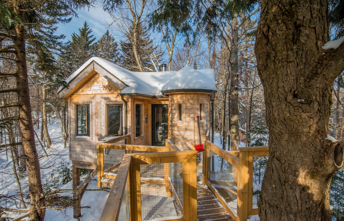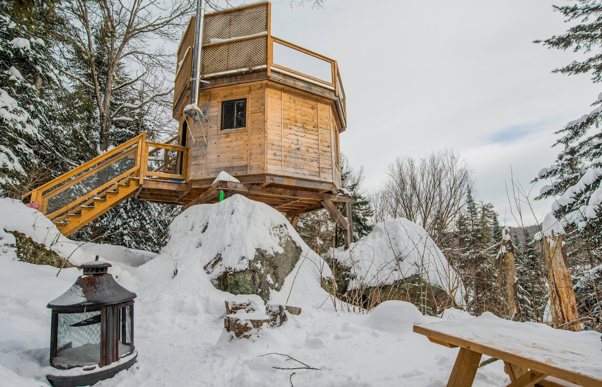 Unique place to enjoy Nature in the region of Laurentians. A treehouse located in an open-air center ( Refuges du lac démélé) with lakes, walking trails, snowshoeing, Nordic cross-country skiing, fishing, swimming. come and realize your childhood dream of spending a stay in a cabin in the nature and getting back to basics: a fire, eating, resting, observing nature ....... (without running water) for 2 adults or 2 adults and 2 children