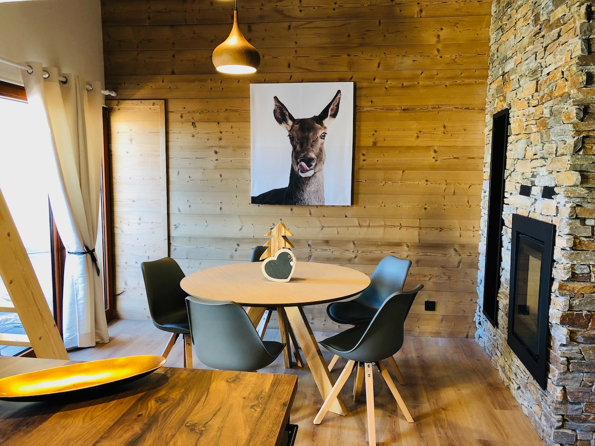Détendez-vous dans ce chalet calme et élégant entièrement rénové,à proximité des navettes (150m) et sentiers de montagne (30m) .Idéal pour 6 ,il est composé de 3 ch et d un coin nuit . RDC: 1 lit en 160 + sdb + wc 1 lit en 160 +sdb A L ETAGE sous les toits 1 lit en 140 +2 lits en 80*190 + sdb. Le salon est equipé d'1 cheminée bio-éthanol(fournit sur demande) vue sur la foret et les montagnes . 1 havre de paix à l'orée des bois.
