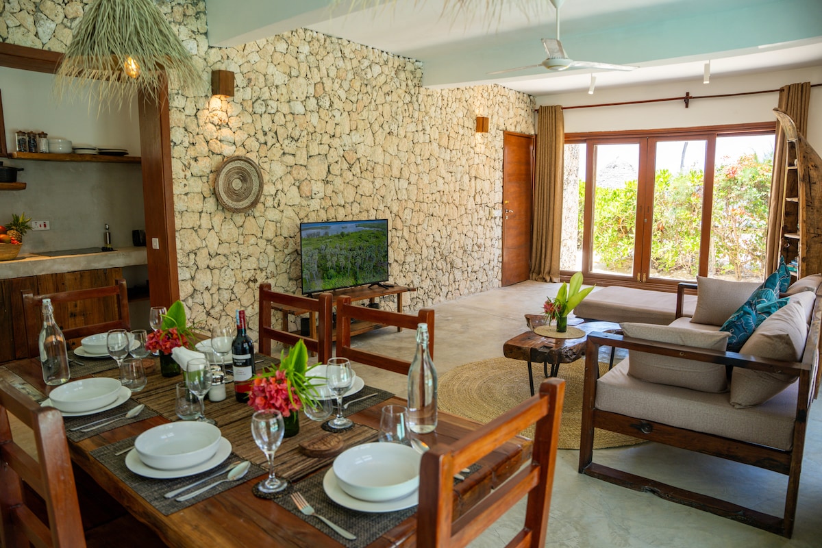 2 bedroom villa with fully equipped kitchen and spacious bathroom. This villa sleeps up to 4 people. A stunning fresh water pool is right in front of the living room and the pristine beach is just few steps away. The property is surrounded by scented Lemon grass(Mchaichai) and many other plants in a secure private residency. All rooms are air conditioned and well ventilated. Cozy outdoor lounge, dinning/BBQ makes a perfect outdoor living. Sunbeds are also available at our private beach.