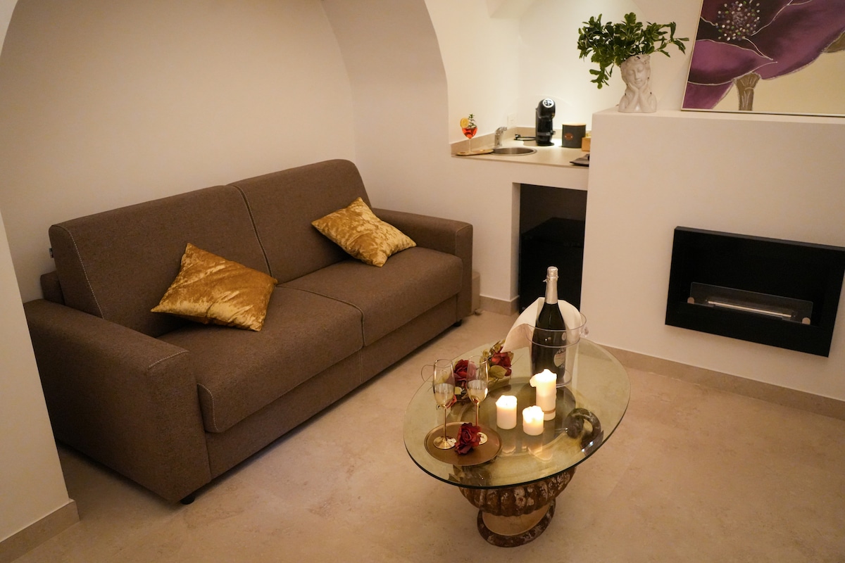 L’ambiente è caratterizzato da pareti in tufo locale e sottotetto in legno. Al centro della stanza,una vasca idromassaggio biposto munita di cromoterapia .Un maestoso camino ed una doccia con vetrata a vista a rendere ancora più suggestiva l' atmosfera. Il bilocale è dotato di bagno privato,wifi ,riscaldamento e impianto stereo . La cucina è corredata di frigo,forno a microonde, piastra ad induzione e macchina per caffè. Colazione e prosecco offerti dalla casa .