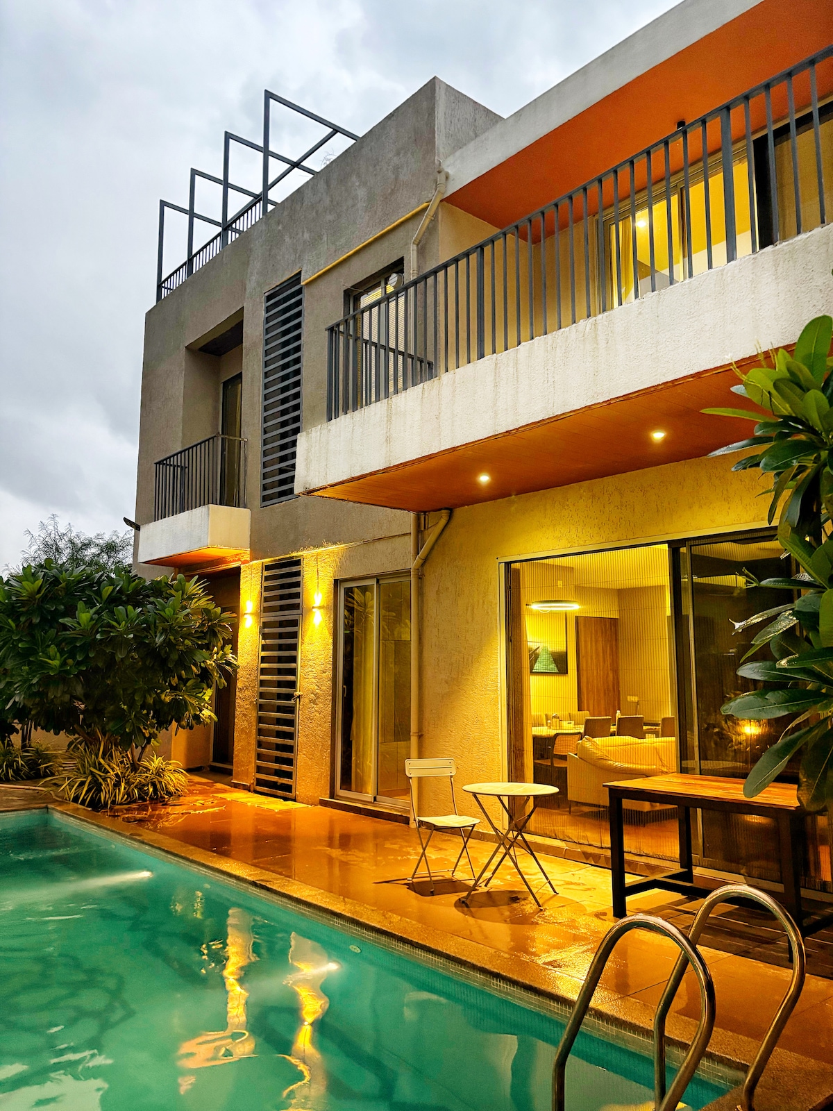 'Villa Elsewhere' is a luxurious, beautiful, private pool villa, just 60-90 mins drive from Mumbai. Surrounded by lush green views of fields, hills, and sounds of nature. The Villa has 3 AC en-suite bedrooms, a large AC living room that opens into a private pool and large deck with a Bar. The kitchen is fully equipped where a chef can make delicious meals (*extra charge). It is pet friendly (*extra fee). BOOK to relax in a calm peaceful vibe, for a get together, or to host the best part ever!