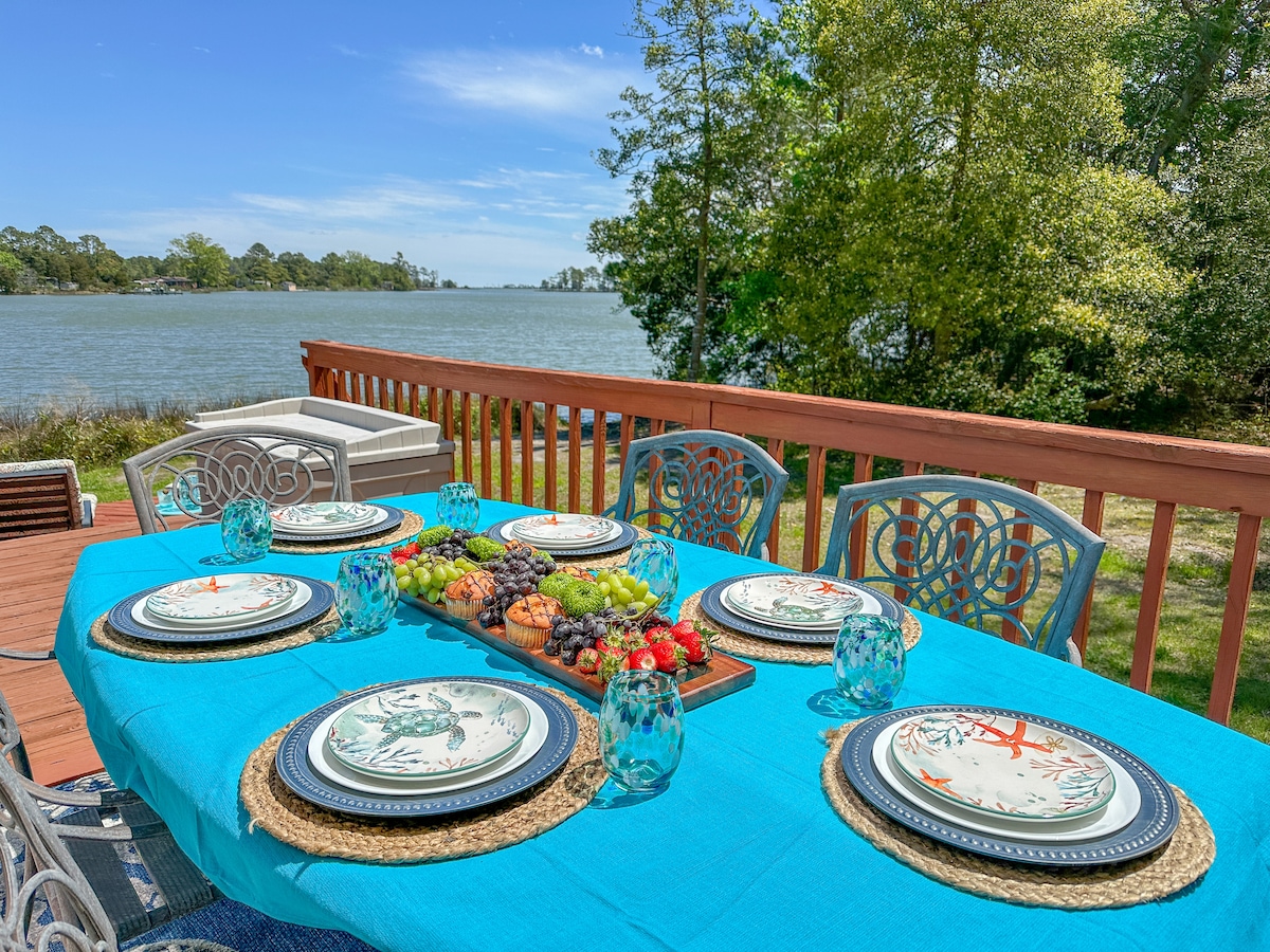 Spacious 5 bedroom waterfront home with private pier, dock, and stunning sunrises AND sunsets! Perfect for both group gatherings and quiet retreats, with a billiard room, theater room, multiple TVs, and an eclectic mix of DVDs, games, and books. Outside, enjoy the deck, lawn, kayaks, cornhole, crab traps, fire pit and more. Bring your boat or fish right off the dock. Beautiful beaches just minutes away!
