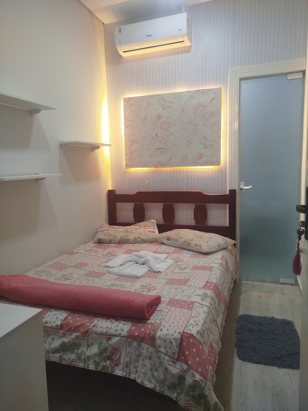 Esse espaço possui banheiro privativo, TV pequena tela plana, ar condicionado, frigobar, blekaute, uma cama de casal e uma de solteiro. É térreo com vista para a rua lateral.