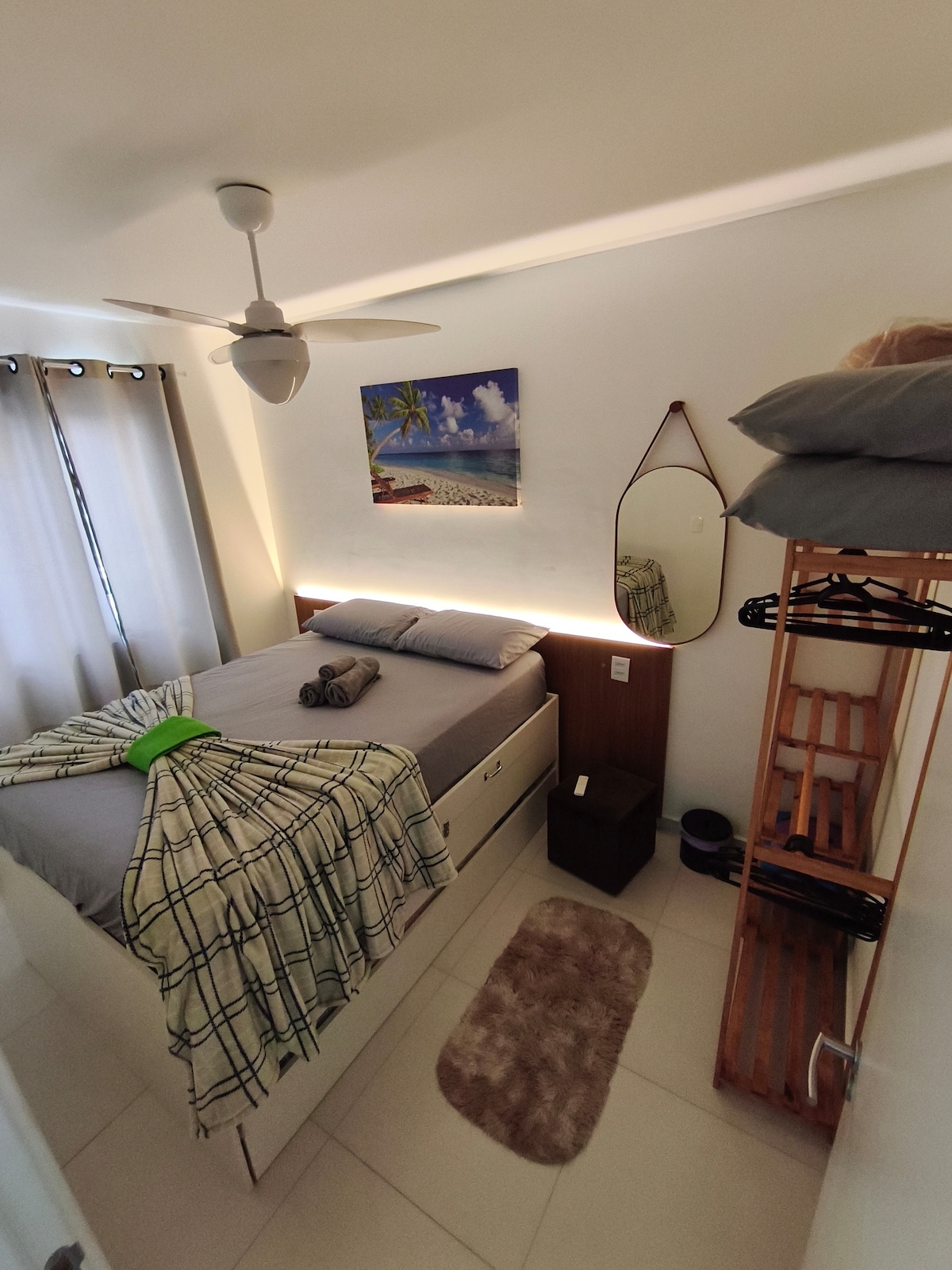 Divirta-se com a sua família neste lugar cheio de estilo, novinho e cheiroso bem próximo à praia. É um espaço bem equipado com 2 quartos com ar condicionado, um banheiro, máquina lava e seca, camas aconchegantes, roupas de cama, toalhas e utensílios de cozinha, tudo para momentos de conforto e descanso. Espaço para suas crianças brincarem e se divertiram na piscina ou em quadra de esportes. Academia com esteira e bicicleta ergométrica. Banheiros auxiliares na área da piscina que ficam próximos.