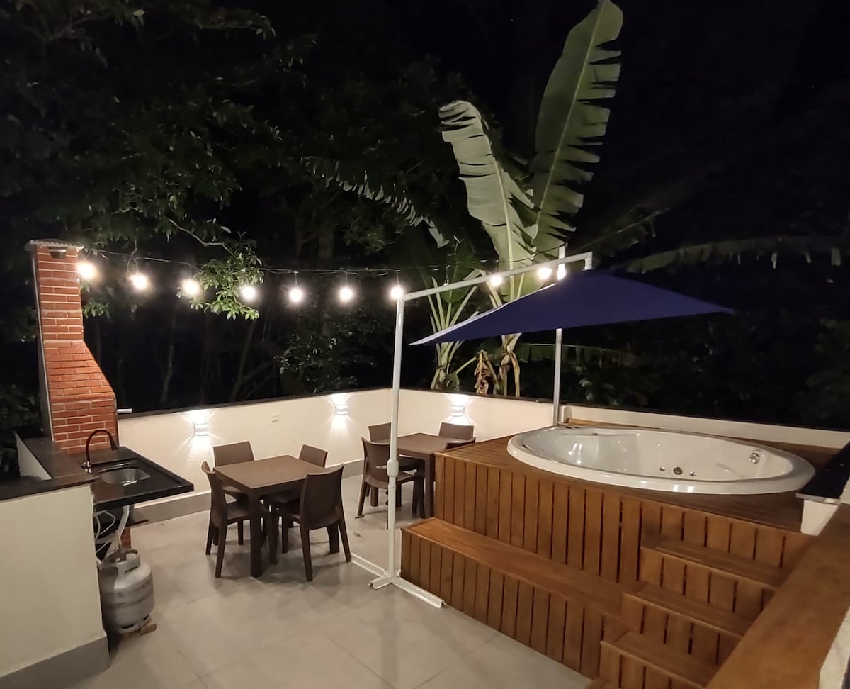 Belissimo Quádriplex novo decoração moderna e praiana 3 suites - 1 das suites tem 2 beliche e 1 cama de casal climatizado sala de jogos amplo terraço com jacuzzi suite master com sacada sala de jogos c/ mesa sinuca lavanderia mictório espaço gourmet com cervejeira anexo com cozinha anexo com sala de estar e lavabo - térreo garagem para 2 carros pequeno porte wifi 5g vista do mar e montanhas do terraço churrasqueira a carvão portão automatizado ducha no térreo tvs smart e cromcast