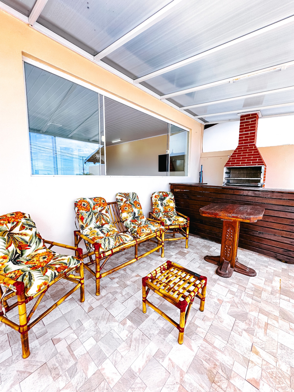 Uma casa ampla, rústica e nostálgica! Com uma decoração pop-art, o espaço combina cores e texturas e é pertinho da praia e do comércio! Ótima para curtir um churrasquinho, curtir o fogão a lenha ou relaxar nos sofás, poltronas ou redes distribuídas pela casa. Possui quintal, fogueira, wi-fi e TV. Localizada próximo à Arena de Shows do Verão Maior Paraná! ATENÇÃO: Não oferece roupas de cama e banho. Os travesseiros e colchões são ofertados com capas protetoras. OBS: Casa de madeira com degraus.