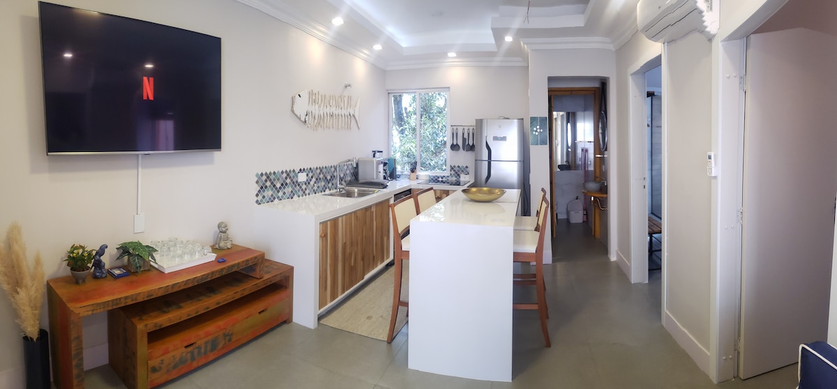Apartamento na cobertura, a 900 metros da Praia de Caiobá e a uma quadra da Avenida JK, em prédio com apenas 2 unidades. Ideal para casais e famílias que buscam conforto e praticidade: suíte com cama king e colchão extra, sala de estar com sofá-cama, Smart TV e Wi-Fi, cozinha equipada com churrasqueira e ar-condicionado, terraço com espreguiçadeiras para curtir o pôr do sol. Acomoda até 6 hóspedes, com mais conforto para 4 pessoas. Roupa de cama incluída, vaga de garagem coberta e pet friendly.