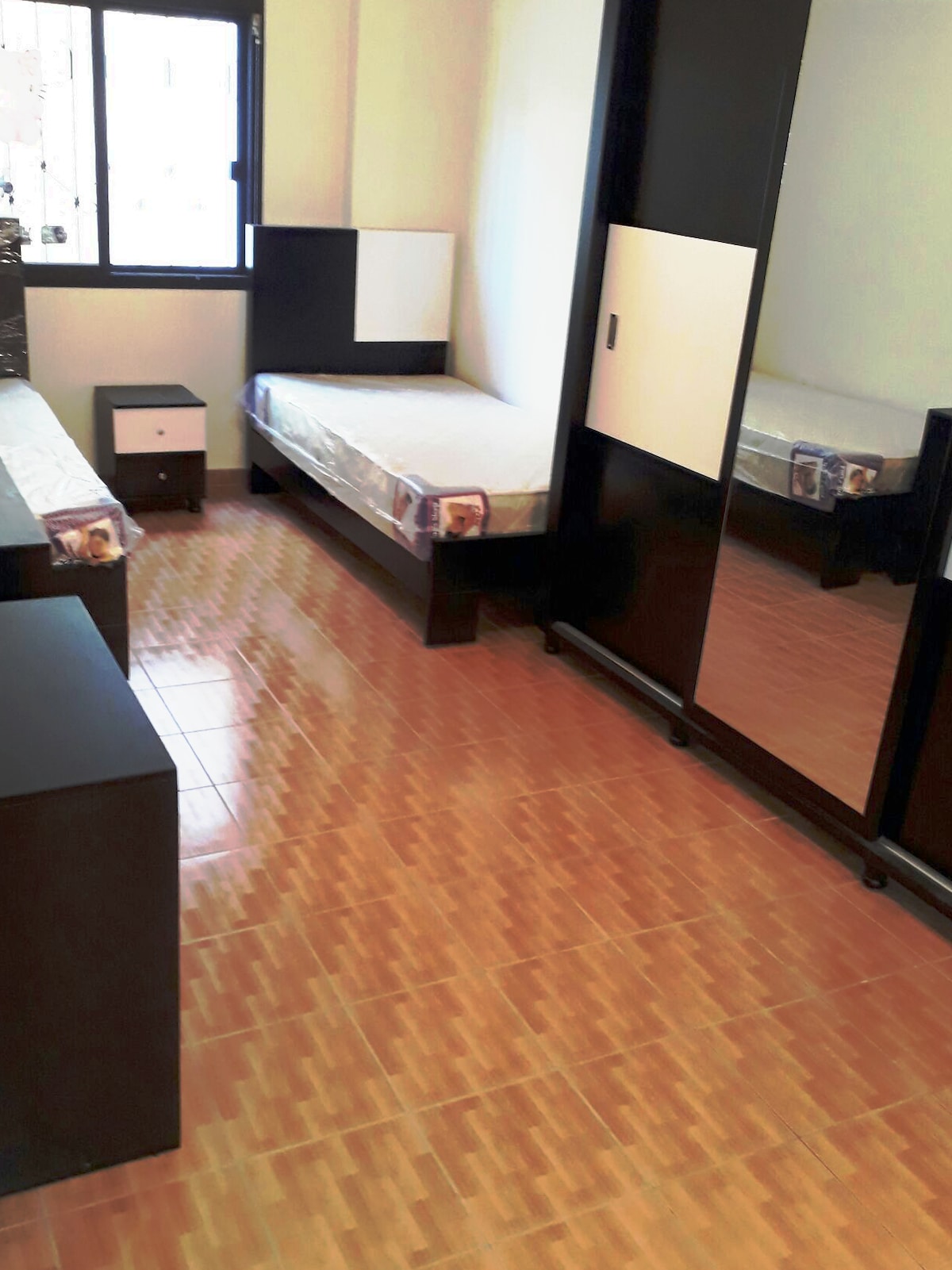 Chalet, ground floor, 1 Bedroom (3 bunker beds), Living room (1 Queen & 1 Single bed), Kitchen & Appliances; balcony and private garden for BBQ area. pool view, access to roof top terrace with 360degrees unobstructed sea and mountain views. The Chalet is in good condition with beautiful wooden cozy decor. Tile floor. Kitchen: refrigerator, washing machine, microwave fully populated with cutlers & utensils and cooker, BBQ set. A/C, TV and Satellite cable, Internet. Private underground parking