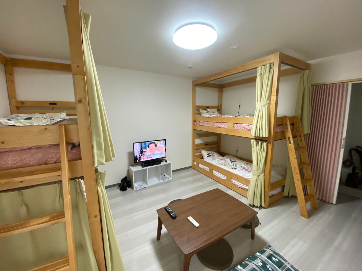 欢迎来到御宝町住宿! 1. 绝佳地理位置,步行 1 分钟到胜山町站,步行 8 分钟到大街道站,从松山机场开车20 分钟即可到达。便利店步行 10 秒,繁华商业区步行几分钟,非常方便。 2. 每间卧室都新安装了 空调,让您的住宿更加舒适。 3. 宽敞的双人床,适合家庭、情侣和朋友入住。 7-Eleven 便利店就在马路对面,步行 10 秒即可到达。周围还有居酒屋、百元店、商店街等生活设施,步行范围内即可轻松到达。 住宿期间可享受免费高速 Wi-Fi。 床型安排: 2 张 双人床(140cm × 200cm × 26cm) 2 张 单人床(100cm × 200cm × 26cm) 1 张 沙发床,最多可容纳 7 人 松山市是四国最大的城市,也是爱媛县的中心地。这里气候温暖,台风较少,还有松山城、道后温泉等著名的历史景点。此公寓步行即可到达松山城,步行加市内电车15 分钟可达道后温泉。 适合商务出差、短期或长期住宿。欢迎咨询中长期住宿事宜! 期待您的预订!