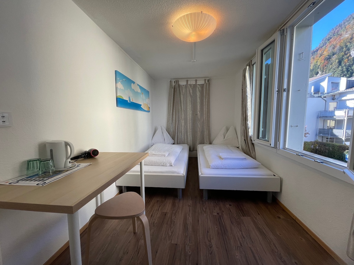 The house is located in the center of Interlaken, just beside the Hoheweg main street with many shop and restaurant, close to the interlaken train station. Thanks to its central location all attractions can be easily reached on foot from the house. There are have 2 single beds. The room has free internet Shared kitchen and shared bathroom. 2 rooms shared one bathroom. The room is not big, just like the picture