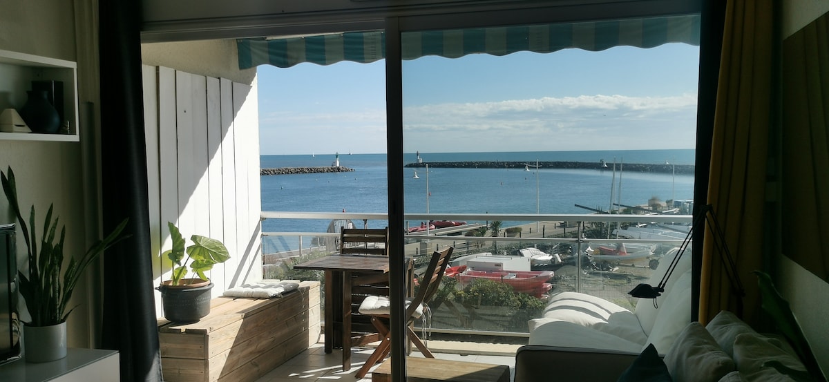 T2 traversant avec grande véranda, lumineux, vue magnifique du port, à 5 min à pied de la plage. Toutes commodités à proximité immédiate, restos, commerces, marché. Lit 2 places et canapé convertible avec couchages de qualité. Cuisine équipée. Douche à l’italienne. WC séparés. Pièce de rangement en sus. Parking privatif gratuit (Stationmt payant à Carnon) Garage à vélos. Fournis : - Draps coton (lits faits avt votre arrivée) - Serviettes de toilette - Draps de plage et parasol - Sèche-cheveux