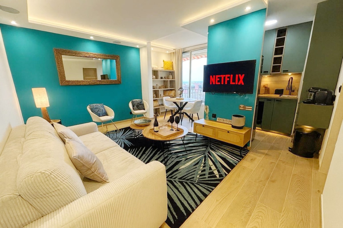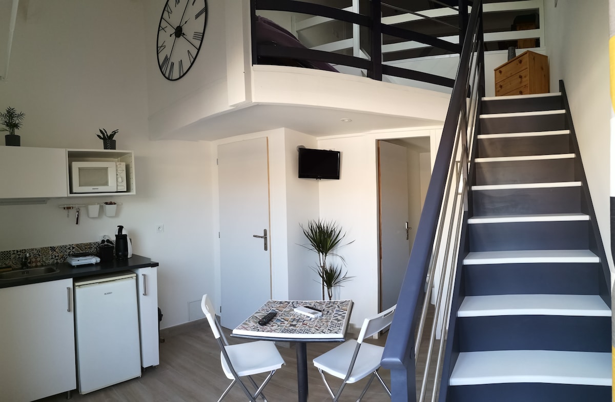 Studio duplex indépendant, 30m2. Attenant à une villa. Quartier Résidentiel, Parking Gratuit. Salon cuisine avec micro ondes, cafetière Dolce Gusto, réfrigérateur et plaque de cuisson. Salle de bain avec douche et vasque + WC, Espace nuit avec lit 140 sur 190, espace bureau avec écran. WiFi TV Amazon Prime, Disney+ Machine à Laver et Sèche Linge sur demande Draps, couette, oreillers et serviettes de toilettes sont fournis. Lit parapluie sur demande. Arrivée tardive possible via boite a clé